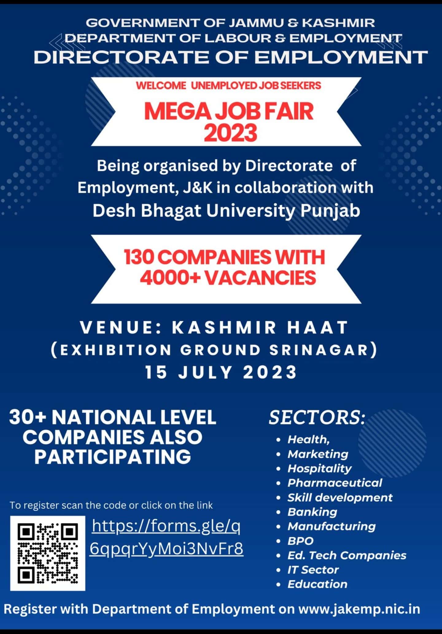 Mega Job Fair in Kashmir on July 15: Jammu and Kashmir, Department of Labour and Employment, J&K Directorate of Employment is going to organize a UT Level Job Fair at Srinagar on 15th of July 2023, where 130 Companies are expected to participate with 4000+vacancies, providing job opportunities in the Sectors of Health, Marketing, Hospitality, Pharmaceutical, Skill Development, Banking, Manufacturing, BPO, Ed. Tech Companies, IT Sector and Education.
