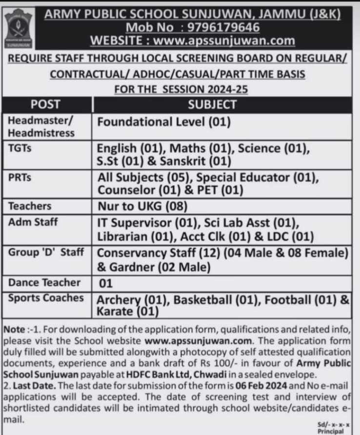Army Public School Sunjuwan Recruitment 2024: Army Public School Sunjuwan Jammu requires Staff through the Local Screening Board (LSB) on a Regular/Contractual/Adhoc/Part-time basis.