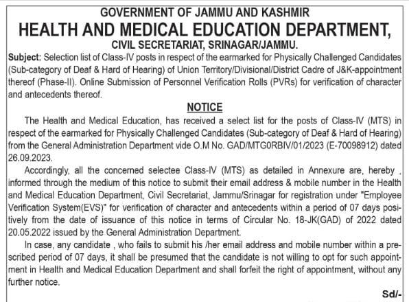 Selection list of Class-IV posts in respect of the earmarked for Physically Challenged Candidates (Sub-category of Deaf & Hard of Hearing) of Union Territory/Divisional/District Cadre of J&K-appointment thereof (Phase-II). Online Submission of Personnel Verification Rolls (PVRs) for verification of character and antecedents thereof.