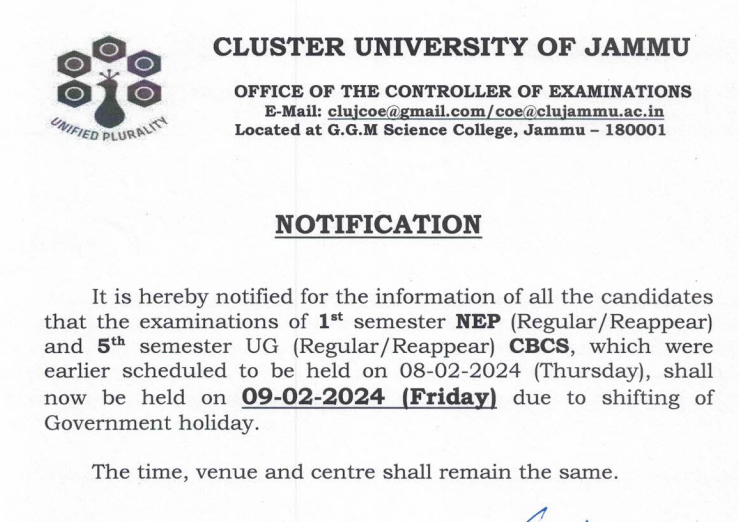 cluster University Jammu Exam Postponed Check New Exam date Latest News Notification School/College Jobs February 7, 2024February 7, 2024JkupdateLeave a Comment on cluster University Jammu Exam Postponed Check New Exam date cluster University Jammu Exam Postponed Check Notification w.r.t postponement of Examinations Jammu University Result Notification Check