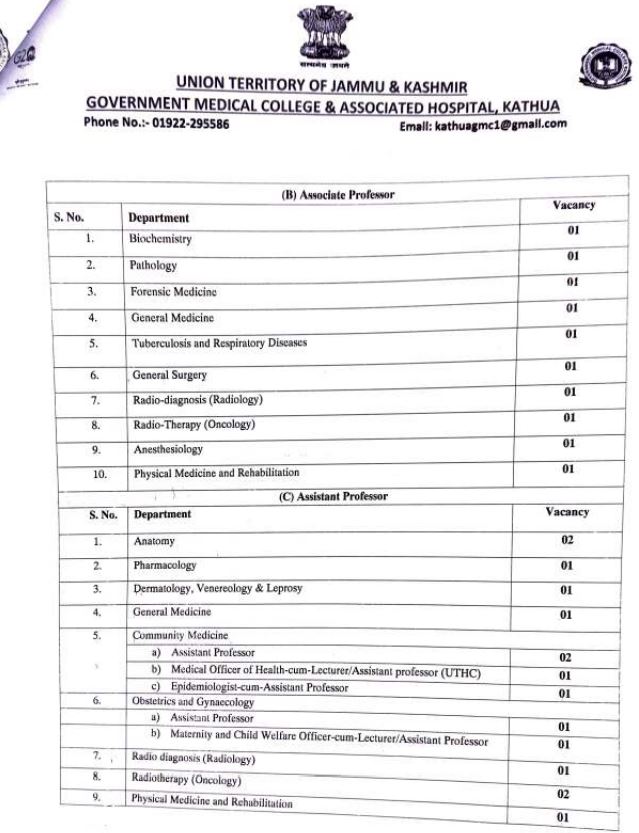GMC Kathua Recruitment 2024: Vacancy 36 Apply: Govt Medical College Kathua has invited applications for the engagement of Professor, Associate Professor and Assistant Professor under SO 364 in Govt. Medical College, Kathua.