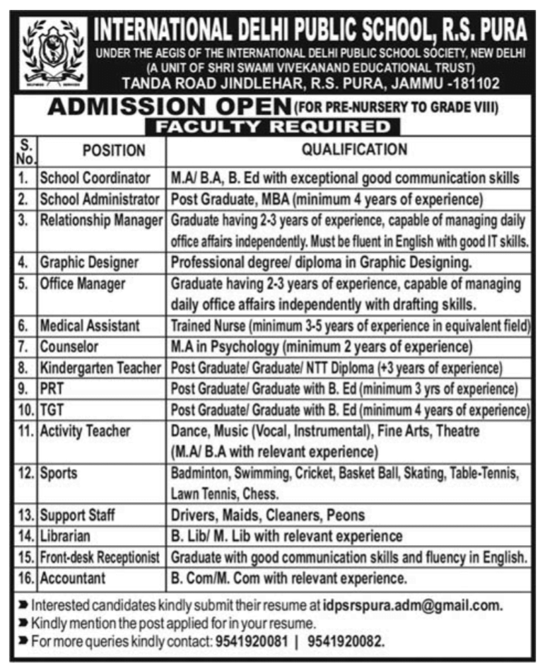 International Delhi Public School Jammu Teacher Recruitment 2024: International Delhi Public School Jammu Hiring Staff: International Delhi Public School RS Pura Jammu has invited application for the recruitment of the following staff vacancies: