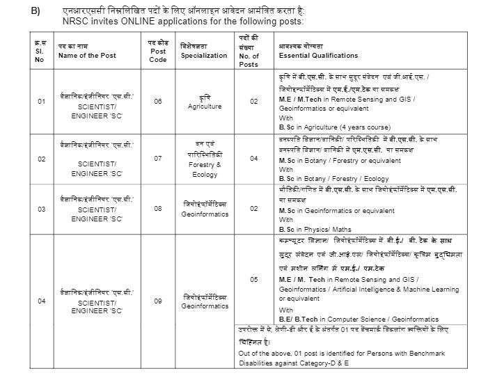- Scientist/ Engineer ‘SC’ (Agriculture/Forestry & Ecology/ Geoinformatics/Geology/Geophysics/Soil Science/Urban Studies/Water Resources): 35 Posts