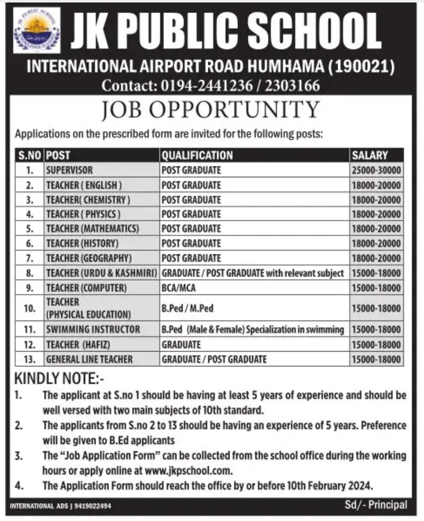 JK Public School Humhama has invited applications in the prescribed format for the following Teaching posts. JK Public School Srinagar Teachers Vacancy: