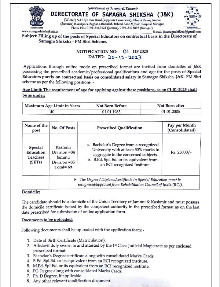 The candidates are required to apply online through the website of the Directorate of Samagra Shiksha (www.samagrashikshajk.nic.in) from 20.12.2023 noon till 05.01.2024.