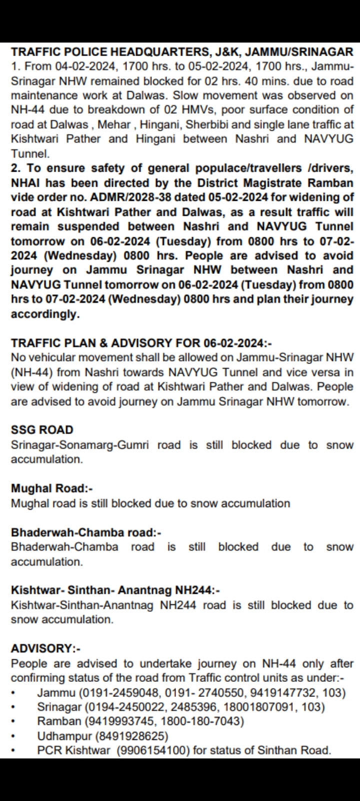 TRAFFIC POLICE HEADQUARTERS, J&K, JAMMU/SRINAGAR Jk Traffic update Today Road Block for 2 hours