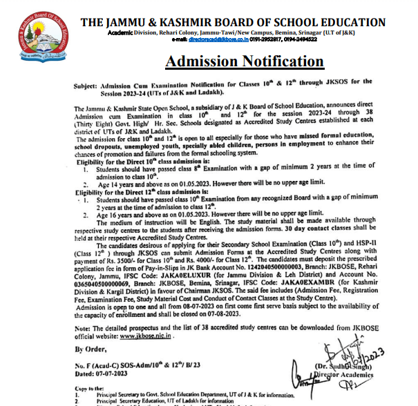 Admission cum Examination notification for Classes 10th and 12th through JKSOS for the session 2023-24 of UTs of J&K and Ladakh.