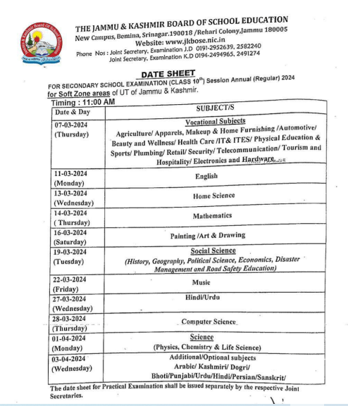 | Date sheet | JKBOSE Class 10th Date sheet 2024: Download pdf |