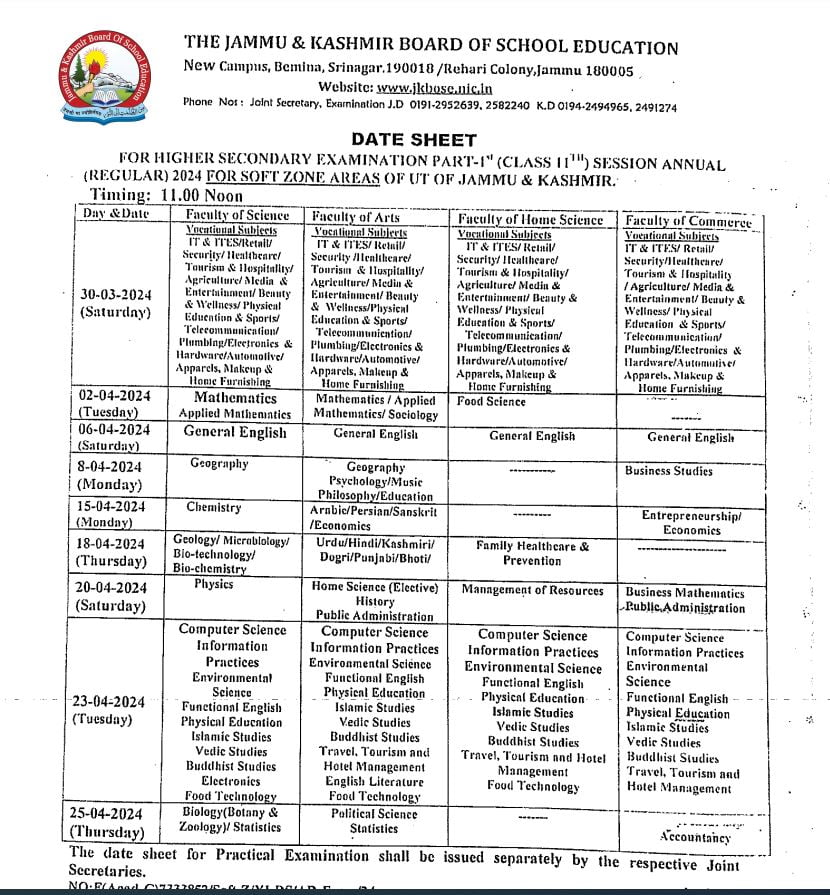 JKBOSE Class 11th Date sheet 2024 Released, Download PDF