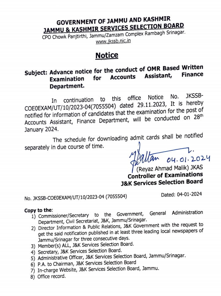 JKSSB Announced Finance Account Assistant Final Exam Date The Divisional Commissioner’s office in Kashmir has received a communication from the Controller of Examination, Jammu & Kashmir Services Selection Board (JKSSB), regarding the conduct of an OMR-based examination for the posts of Accounts Assistant in the Finance Department under the Union Territory (UT) cadre.