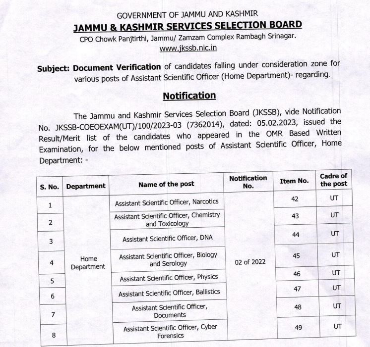 JKSSB Assistant Scientific officer (ASO) document verification list released download pdf