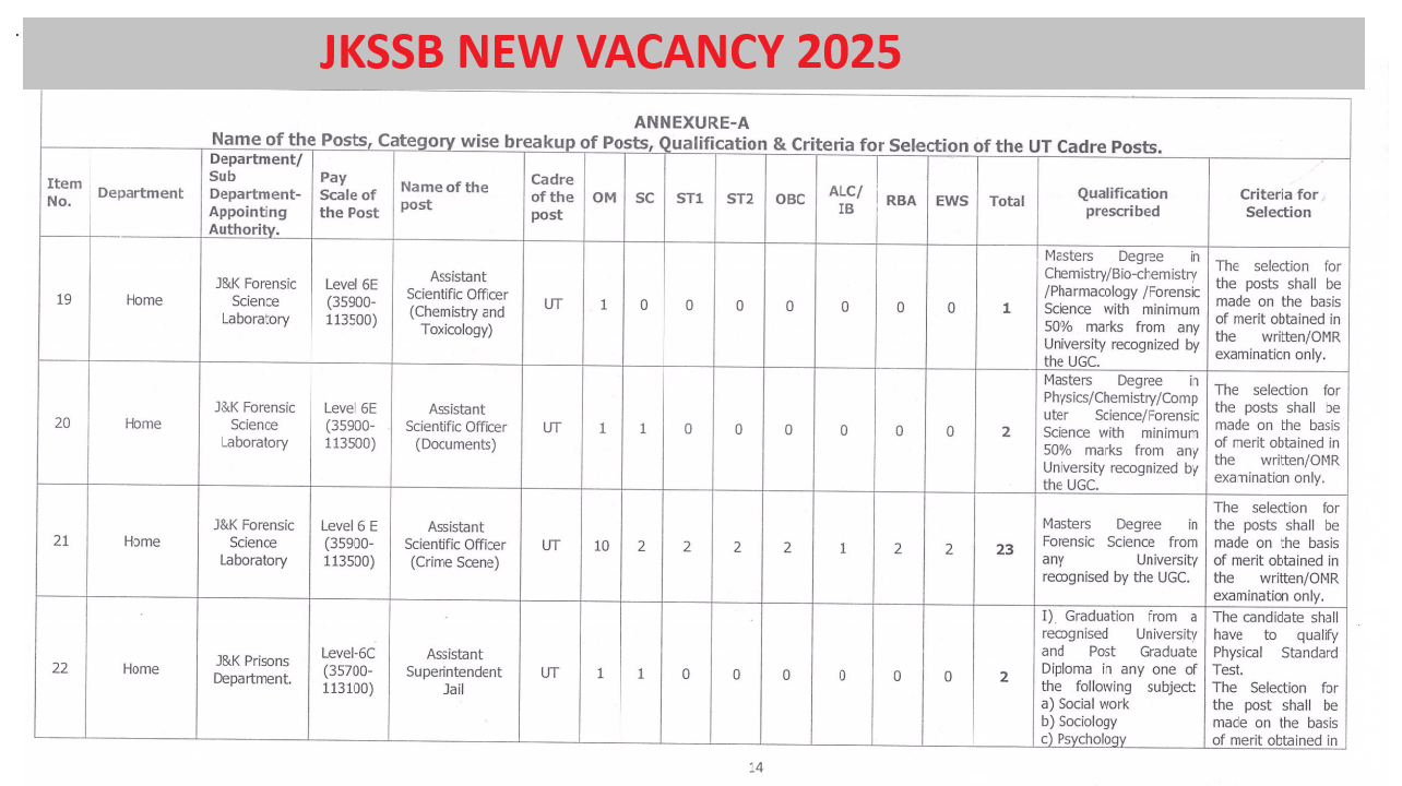 JKSSB New Vacancy 2025 Check Eligibility Salary Apply Online: Jammu & Kashmir Services Selection Board (JKSSB) has released Advertisement Notification No. 06 of 2025 dated 22.07.2025 for the recruitment of various UT Cadre posts in the Home Department. A total of 61 vacancies are open across different roles including Assistant Scientific Officer, Assistant Superintendent Jail, Computer Assistant, and Laboratory Attendant.