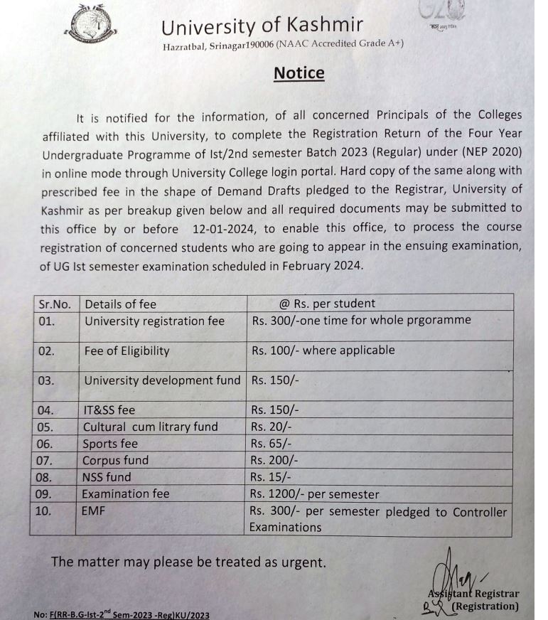Notification regarding Registration Return of 04 Year UG programme of 1st/2nd Semester Batch 2023 (Regular) under (NEP 2020); Dated:Â 2-2-2024