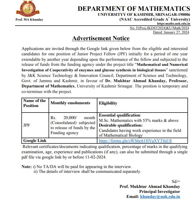 Kashmir University Recruitment 2024 Apply Online Dept of Mathematics Recruitment 2024: The University of Kashmir, Deptt. of Mathematics has invited applications through the online filling of Google form from eligible candidates for the post of Junior Project Fellow (JPF) under the project title “Mathematical and Numerical Investigation of Cooperativity of Enzymes and glucose synthesis in biological tissues” sanctioned by J&K Science Technology & Innovation Council, Department of Science and Technology, Govt. of Jammu and Kashmir, in favour of Dr. Mukhtar Ahmad Khanday, Professor, Department of Mathematics, the University of Kashmir Srinagar.