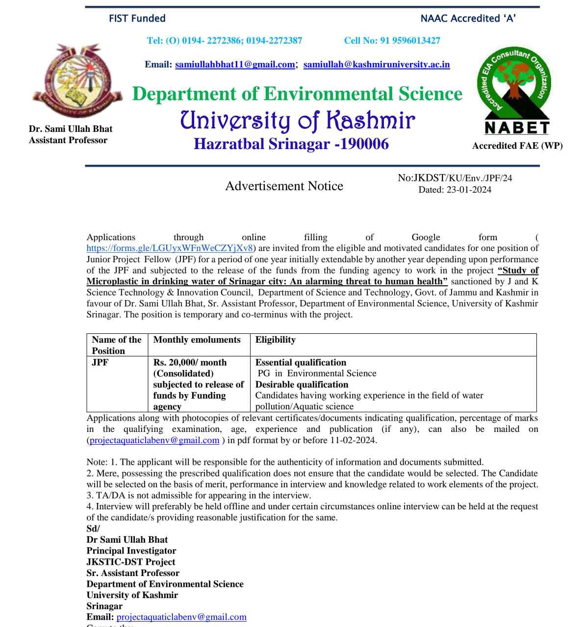University of Kashmir Department of Environmental Science Seeks Assistant Professor in Water