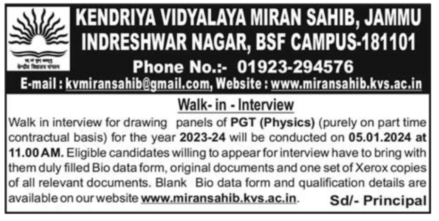 KV School Miran Sahib Teacher Recruitment 2024: Apply: Kendriya Vidyalaya Miran Sahib has invited eligible candidates for walk-in interview for the recruitment to the Teaching staff Vacancy. Walk-in interview for drawing panels of PGT (Physics) (purely on part time contractual basis) for the year 2023-24 will be conducted on 05-01-2024 at 11.00 AM.