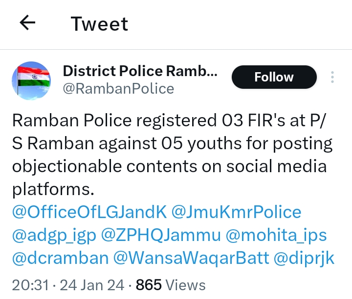 Ramban Police registered 03 FIR’s at P/S Ramban against 05 youths for posting objectionable contents on social media platforms. Police registered FIR Against 05 youths for posting objectionable contents.