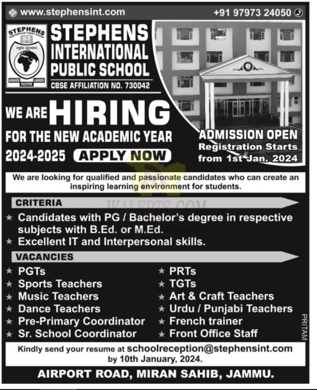Private School Jobs In Jammu and Kashmir Jobs in Stephens International Public School.
