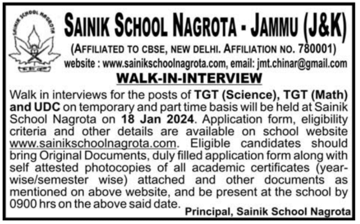 The Walk-in interview is scheduled to be held at Sainik School Nagrota on 18 January 2024.