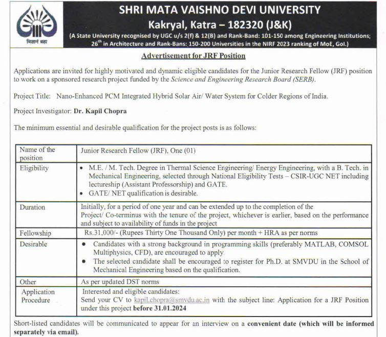 SMVDU Recruitment 2024: Apply Online Shri Mata Vaishno Devi University has invited applications for highly motivated and dynamic eligible candidates for the Junior Research Fellow (JRF) position to work on a sponsored research project funded by the Science and Engineering Research Board (SER