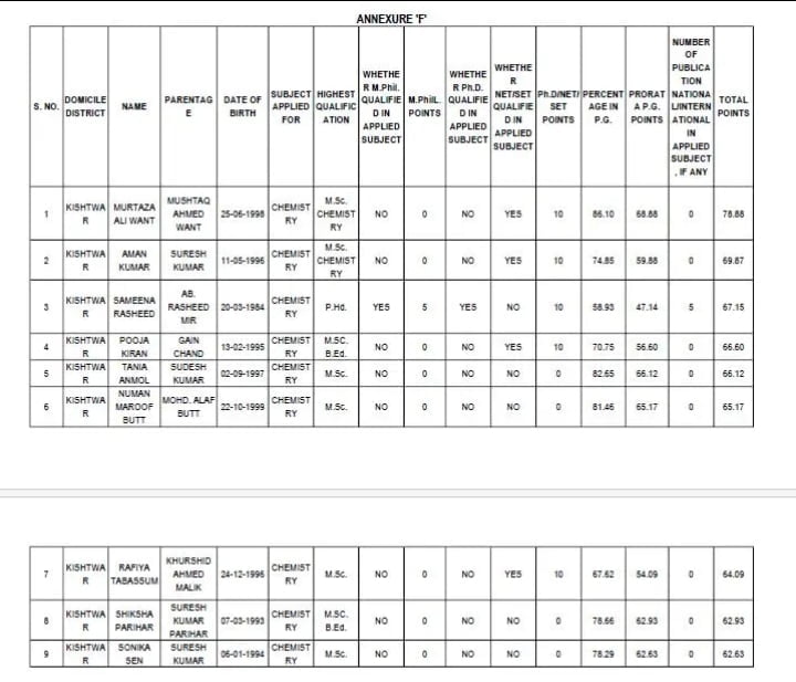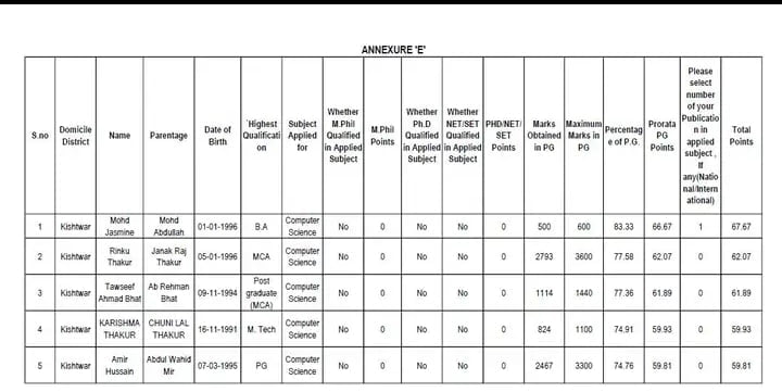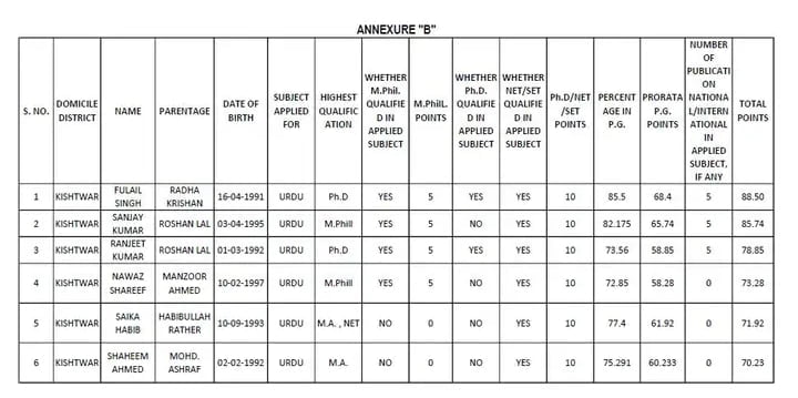 Teacher Cluster Final Merit List District Kishtwar