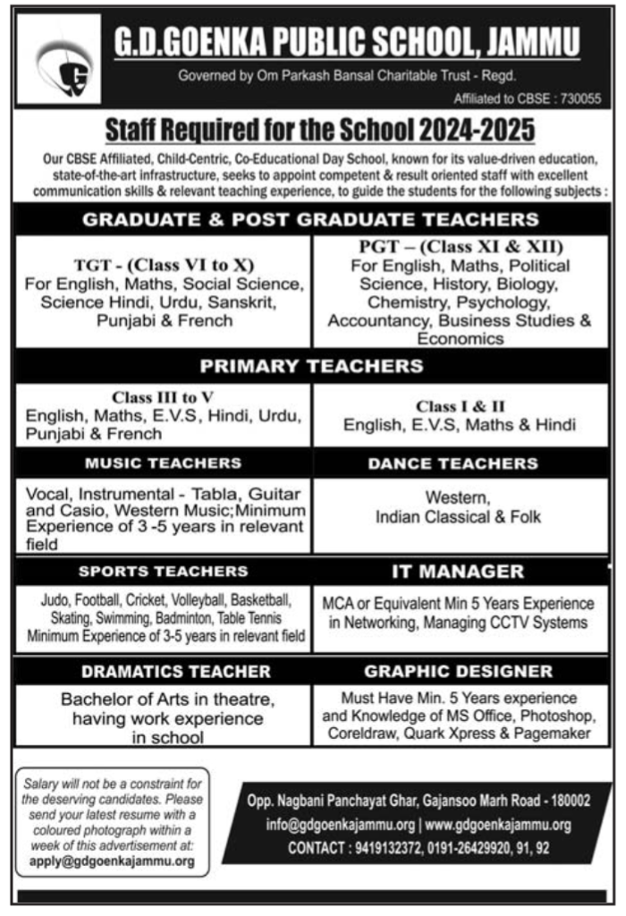 Teacher Recruitment In J&K G.D. Goenka Public School Vacancy 2024: G.D. Goenka Public School has invited applications for the following Staff vacancies for session 2024-25.