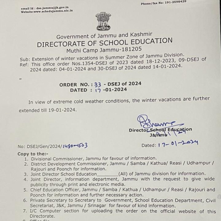 Winter Vacations For Jammu Summer Zone Schools Extended Up To Jan 19 In view of prevailing harsh cold conditions, the Directorate of School Education has further extended winter vacations in all private and Government schools falling in the Summer Zone of Jammu Division till January 19.